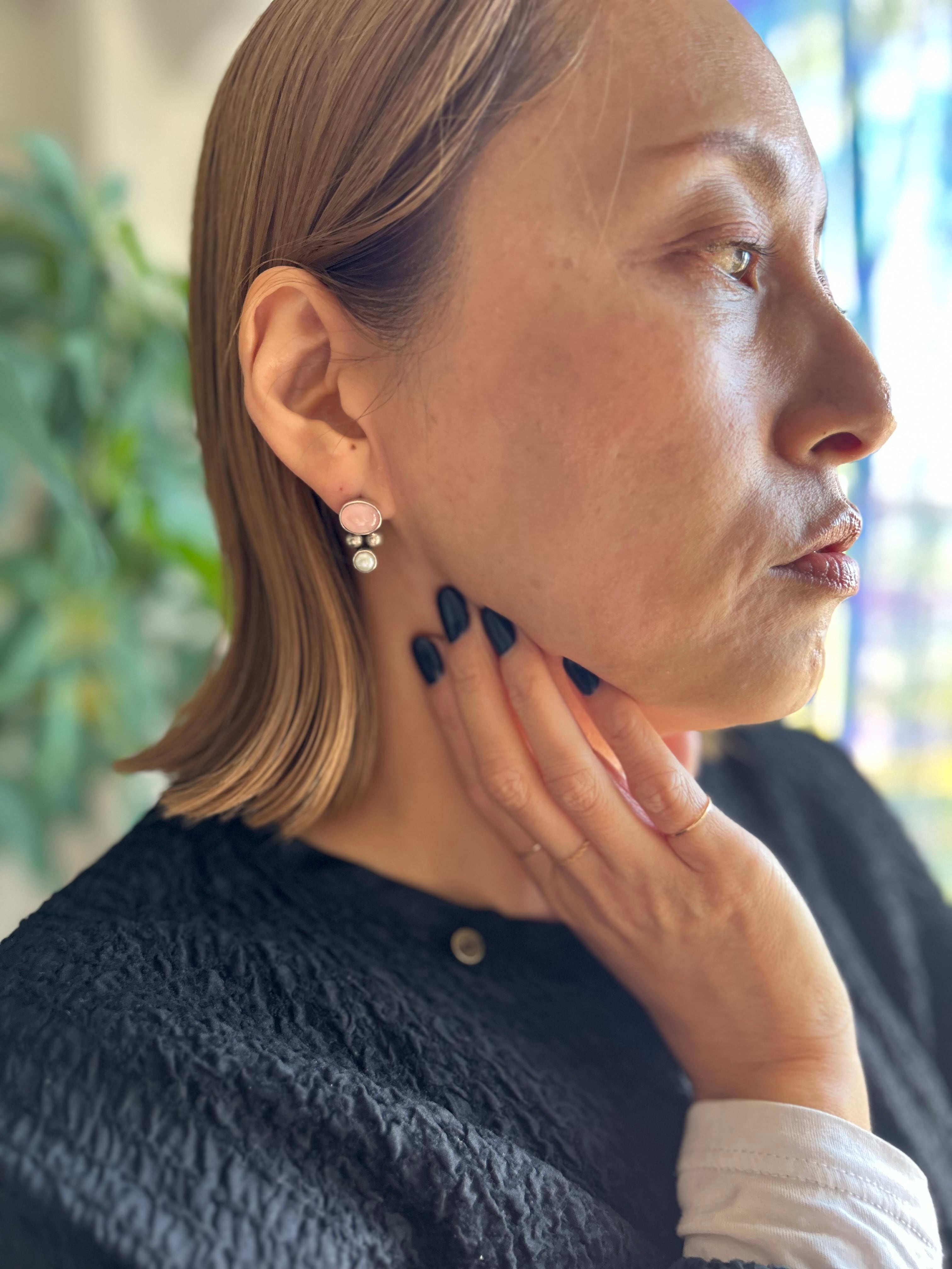 ローズクォーツと淡水パールの組み合わせが可愛いピアス。